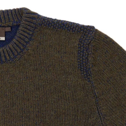This Men’s Army Green Crew Neck Lambswool Jumper is knitted with dark indigo blue seed stitch detail