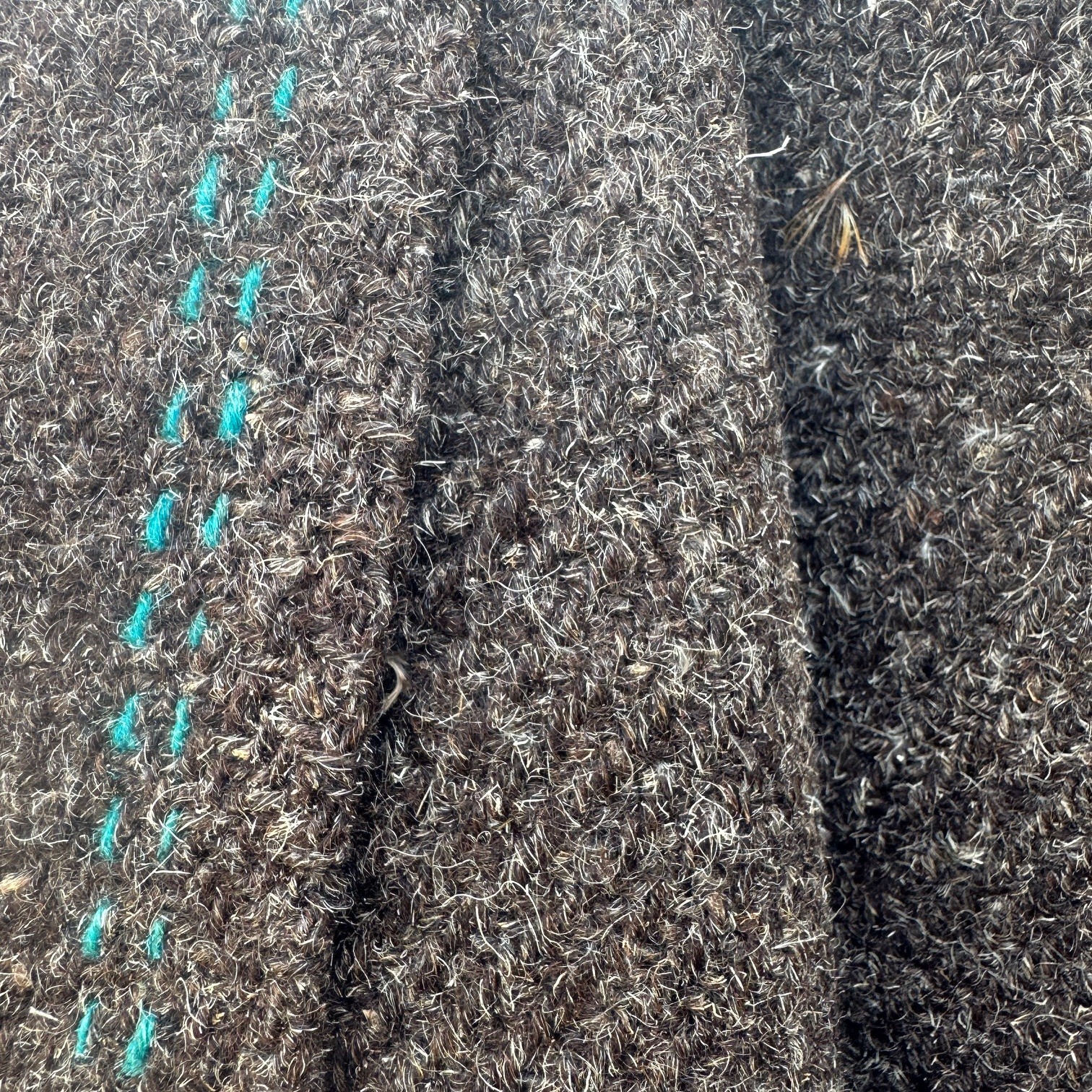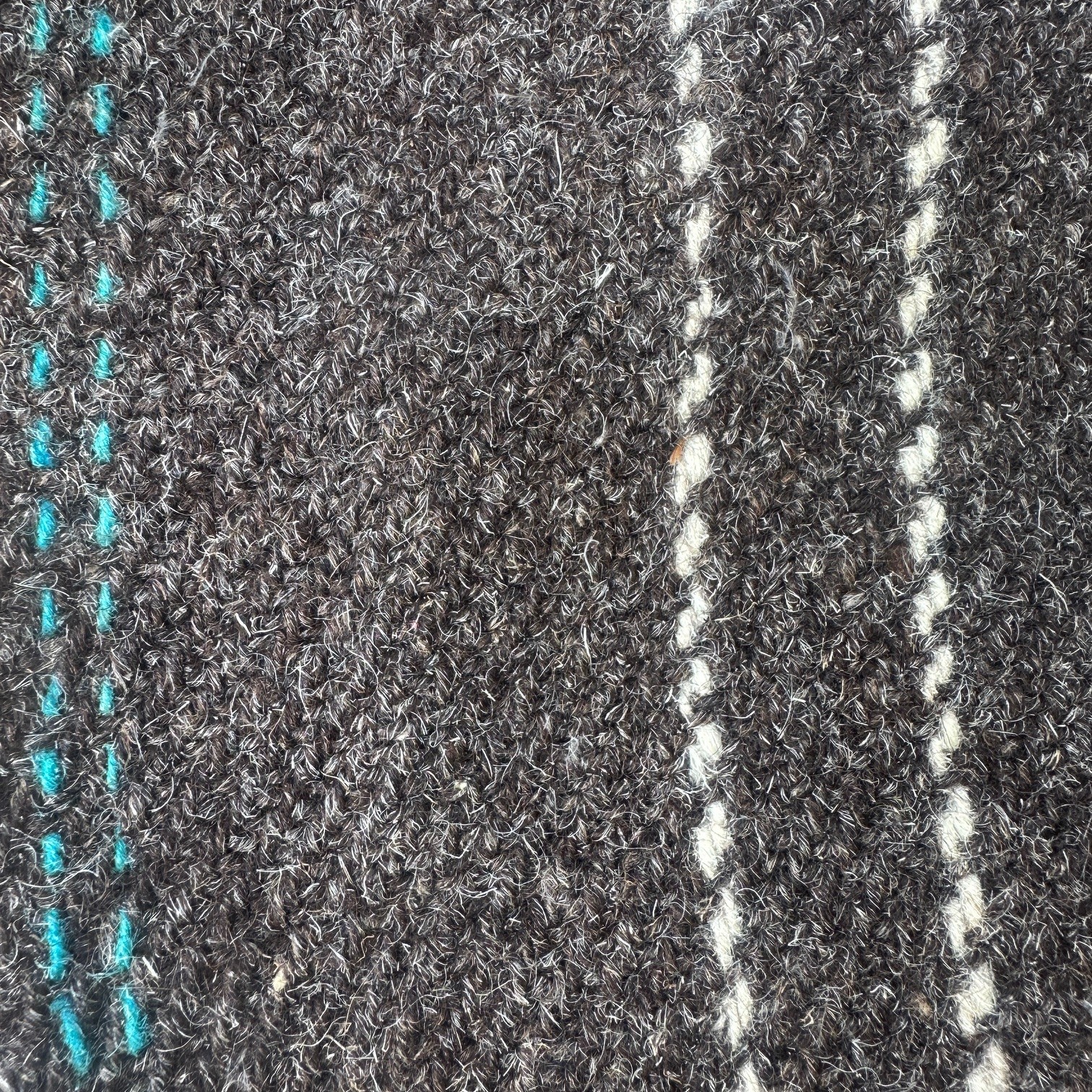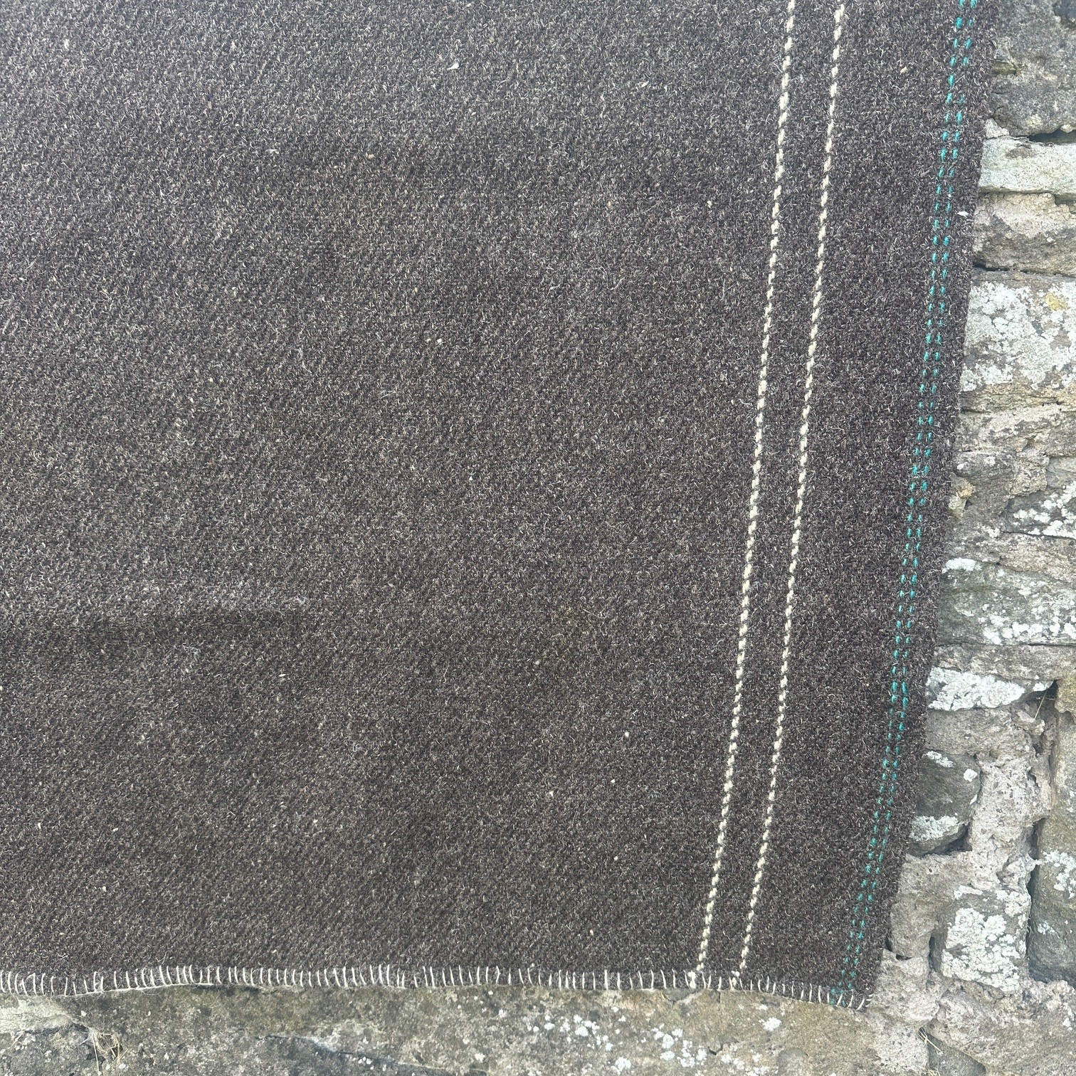 Woven in brown wool with vertical stripes of cream stitching on one side and and with vertical turquoise stripes on either side of the blanket