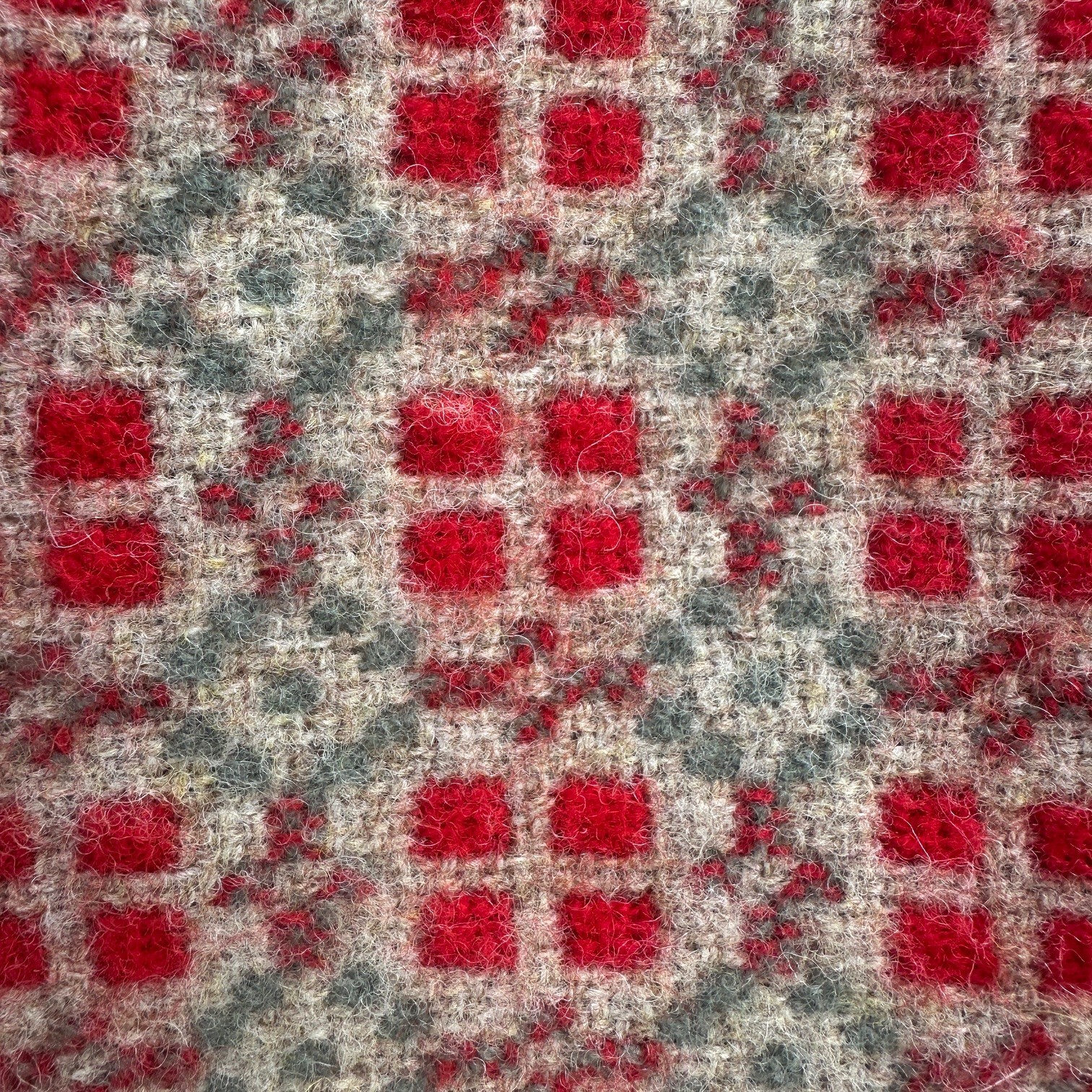 Woven in softer wool in a geometric design in shades of scarlet red, jade green and stone