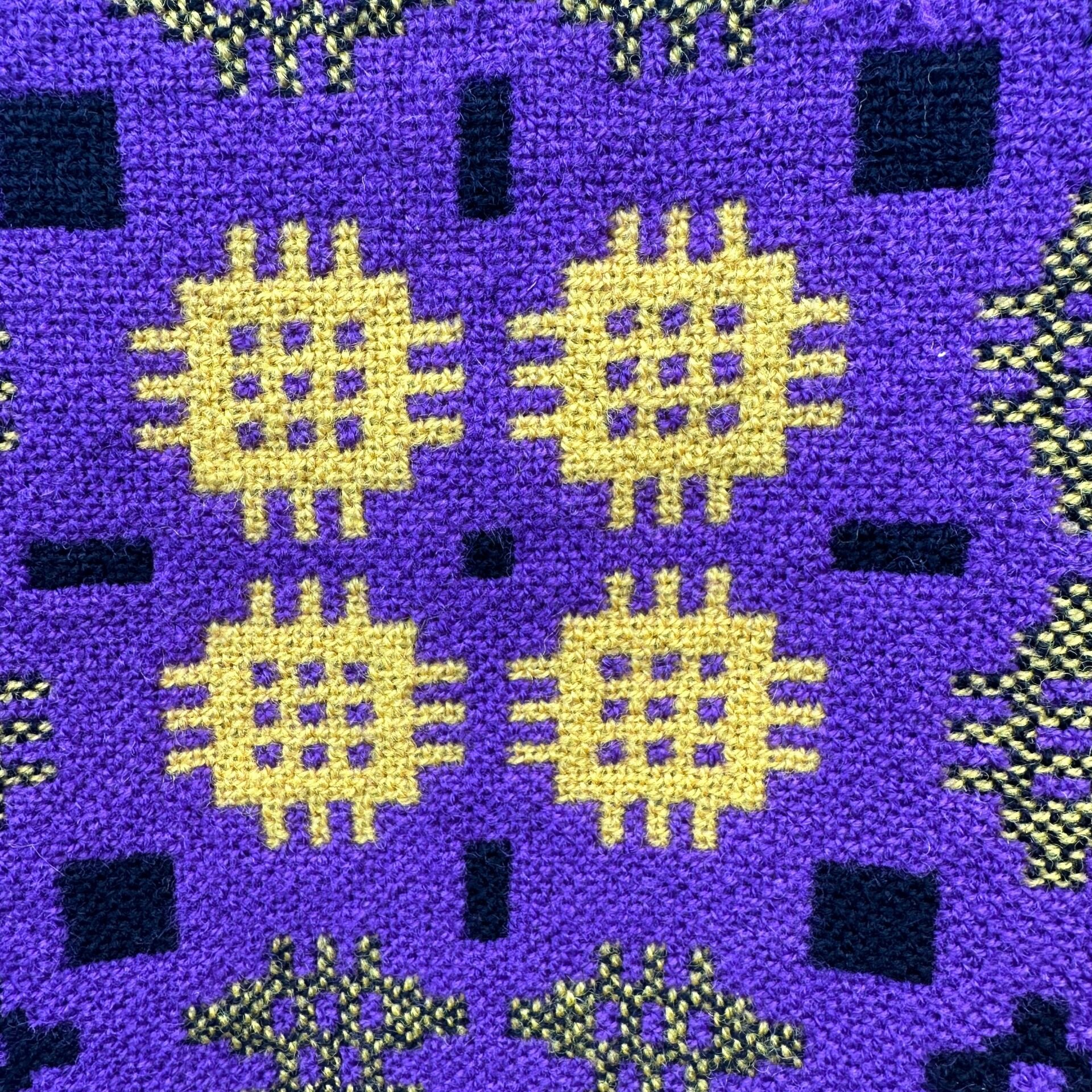 Woven in a traditional geometric pattern in shades of violet, daffodil yellow and jet black